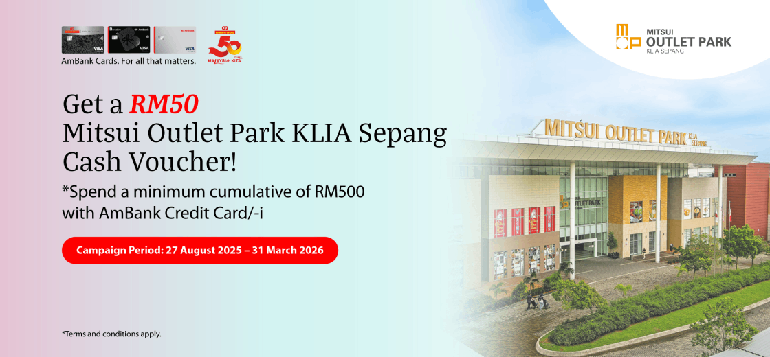 Spend a minimum of RM500 with your AmBank Credit Card/-i to redeem RM50 Mitsui Outlet Park KLIA Sepang Cash Voucher!