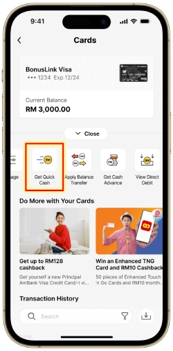 Enjoy the convenience of withdrawing advance cash from your AmBank Credit Card/-i. Simply apply for QuickCash via the AmOnline App and turn it into monthly affordable instalment plans of up to 60 months.