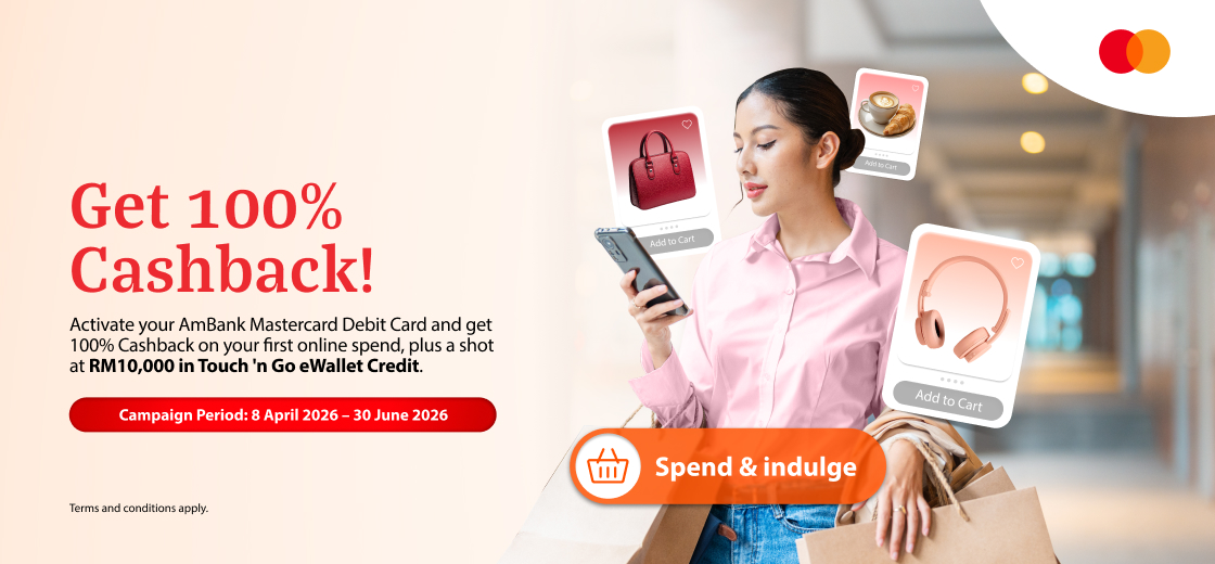 Start shopping online with your AmBank Mastercard Debit Card and enjoy a rewarding first spend with 100% Cashback. You can also get 50% Cashback on your second online spend. Not only that, be in the running to be rewarded with RM10,000 in Touch 'n Go eWallet Credit.