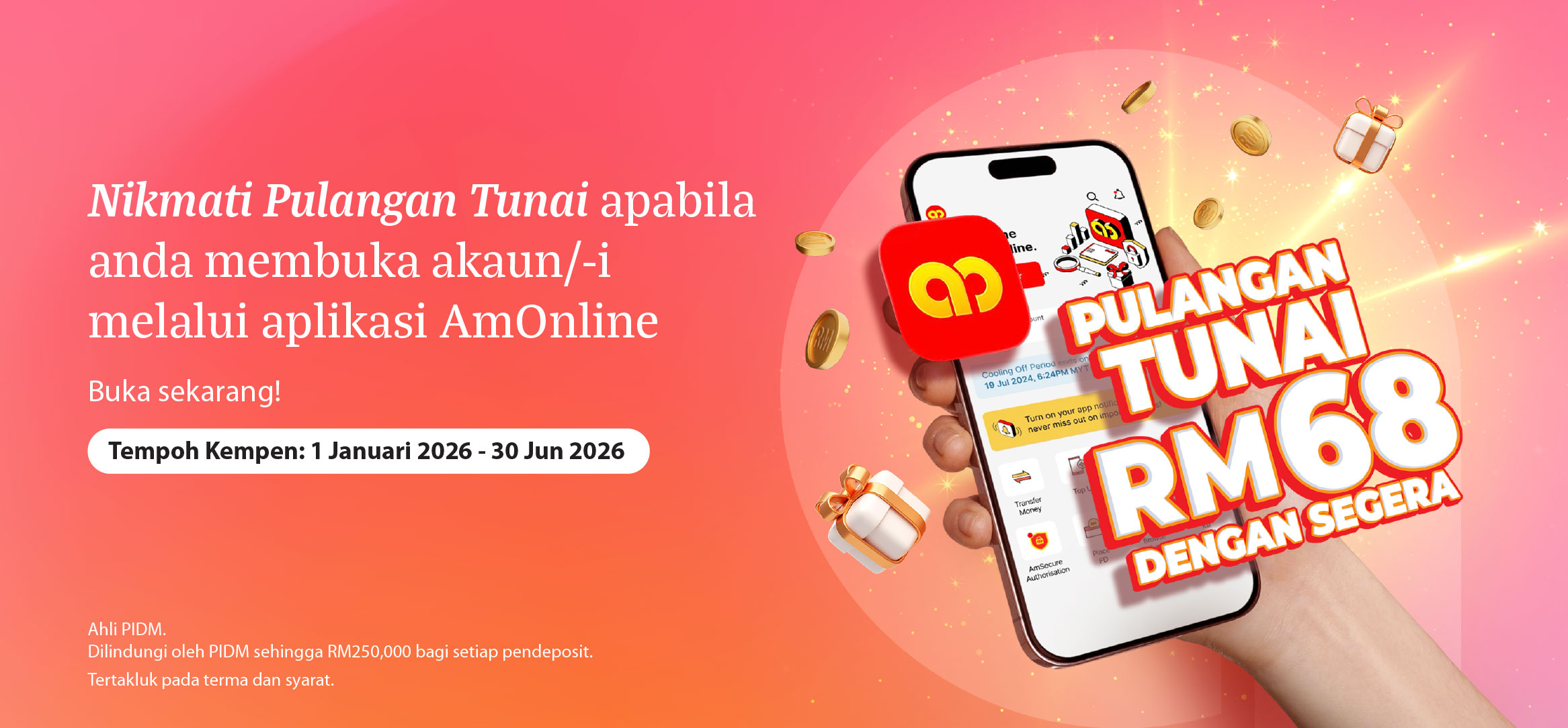 Jadilah antara 10 pelanggan terawal yang membuka Akaun Simpanan/-i atau Semasa/-i baharu melalui Aplikasi AmOnline pada mana-mana hari Sabtu atau Ahad dalam bulan Februari atau Mac sepanjang Tempoh Kempen dan nikmati ganjaran Pulangan Tunai RM68 dengan serta-merta!