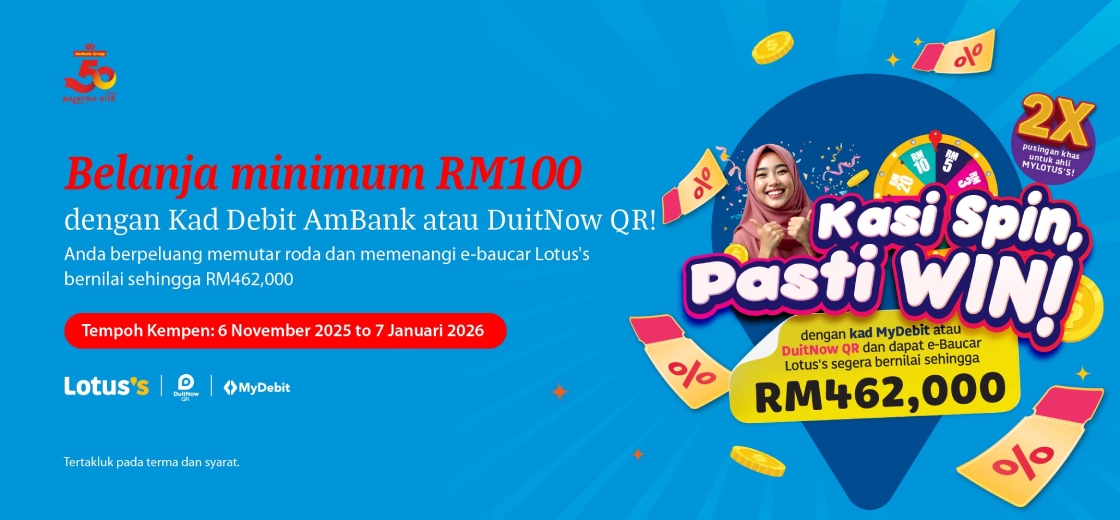 Belanja minimum RM100 dengan Kad Debit AmBank atau Duitnow QR!
