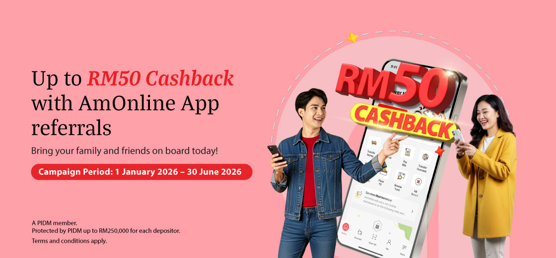 Invite your family and friends to open a savings or current account/-i via AmOnline App and earn extra Cashback: